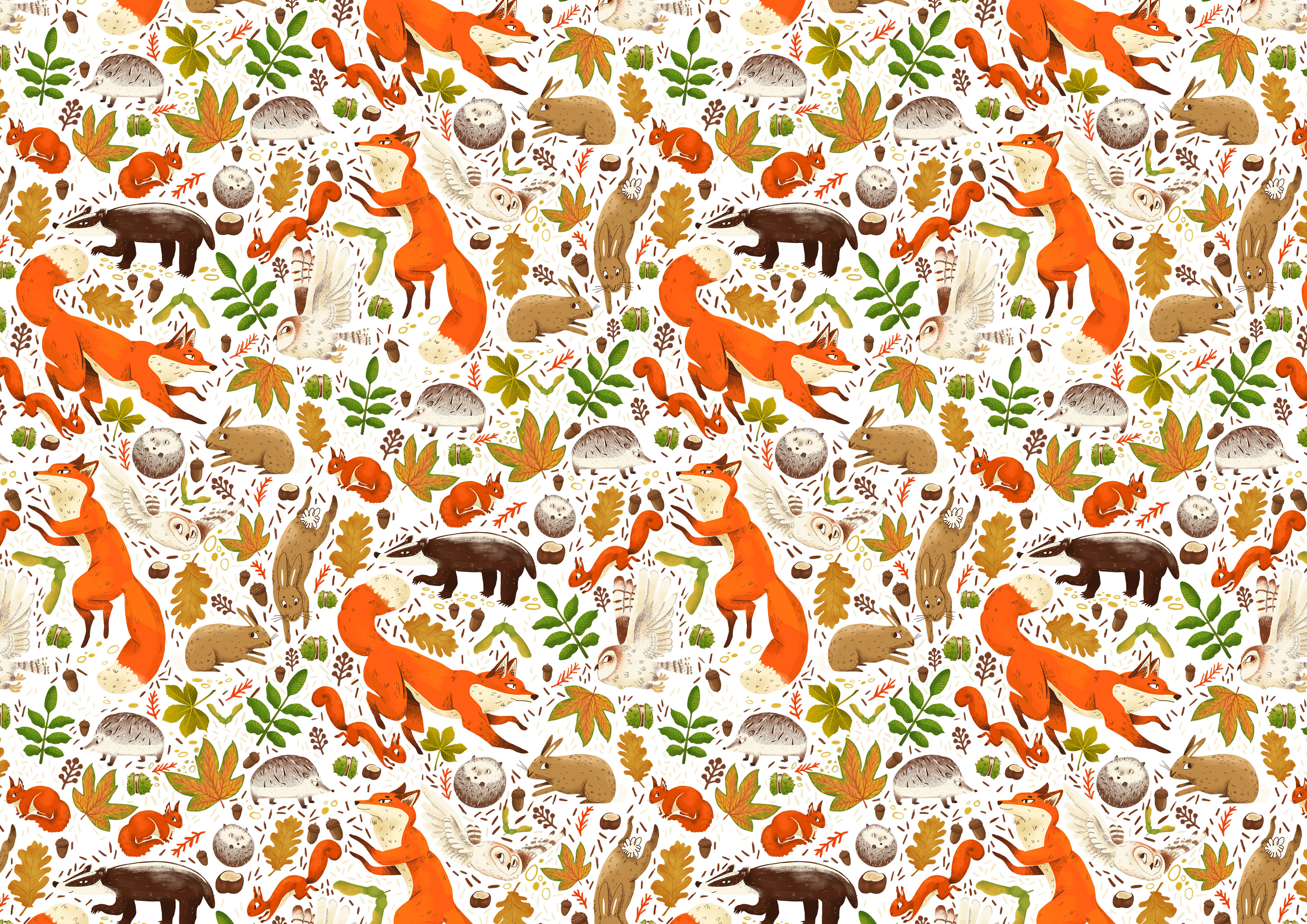 A pattern originally inspired by Beatrix Potter, but the focus shifted to celebrating UK woodland creatures and tree leaves seeds and nuts. The key colour was the burnt orange/reds of the foxes and squirrels which lends itself for an autumnal feel.