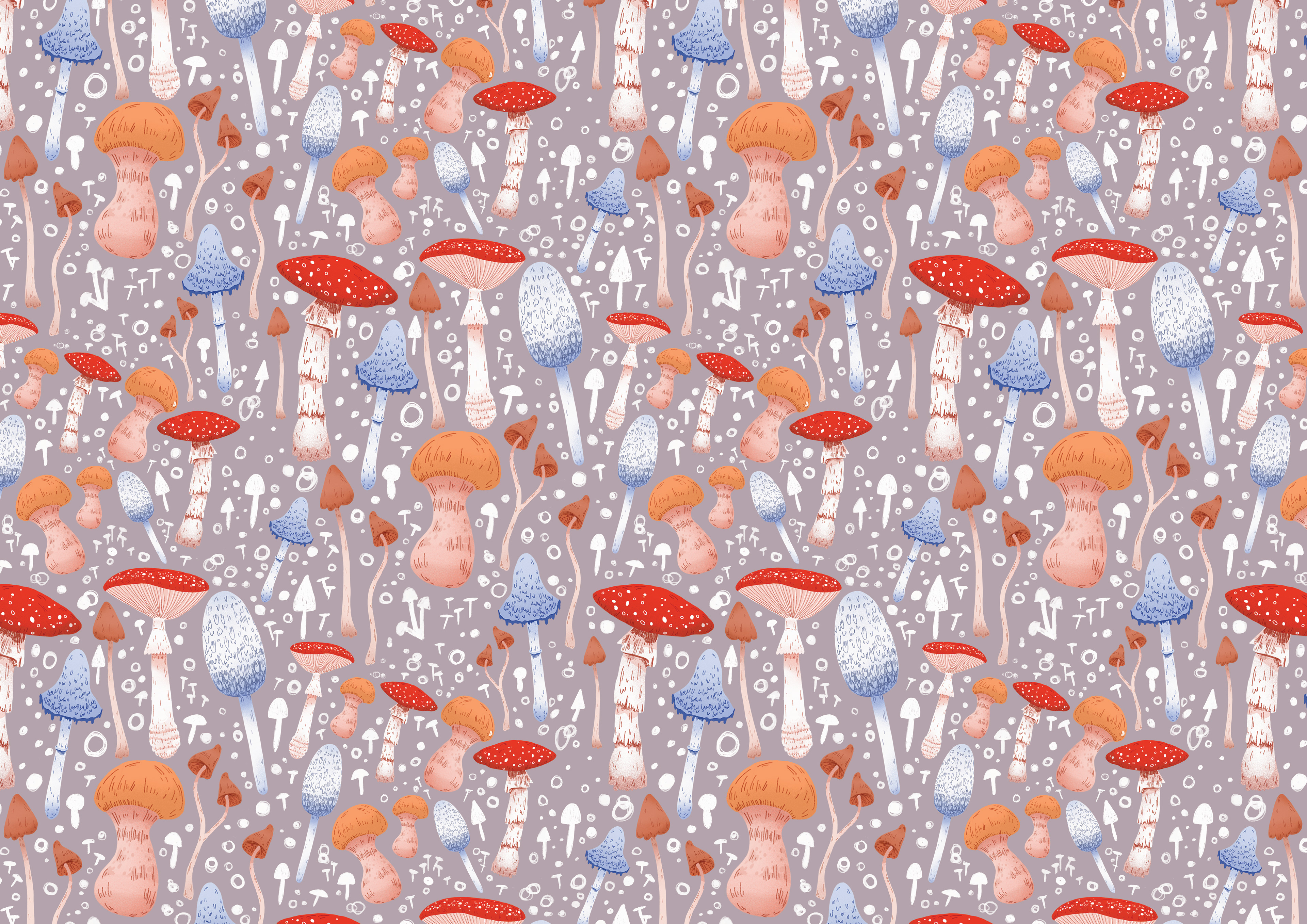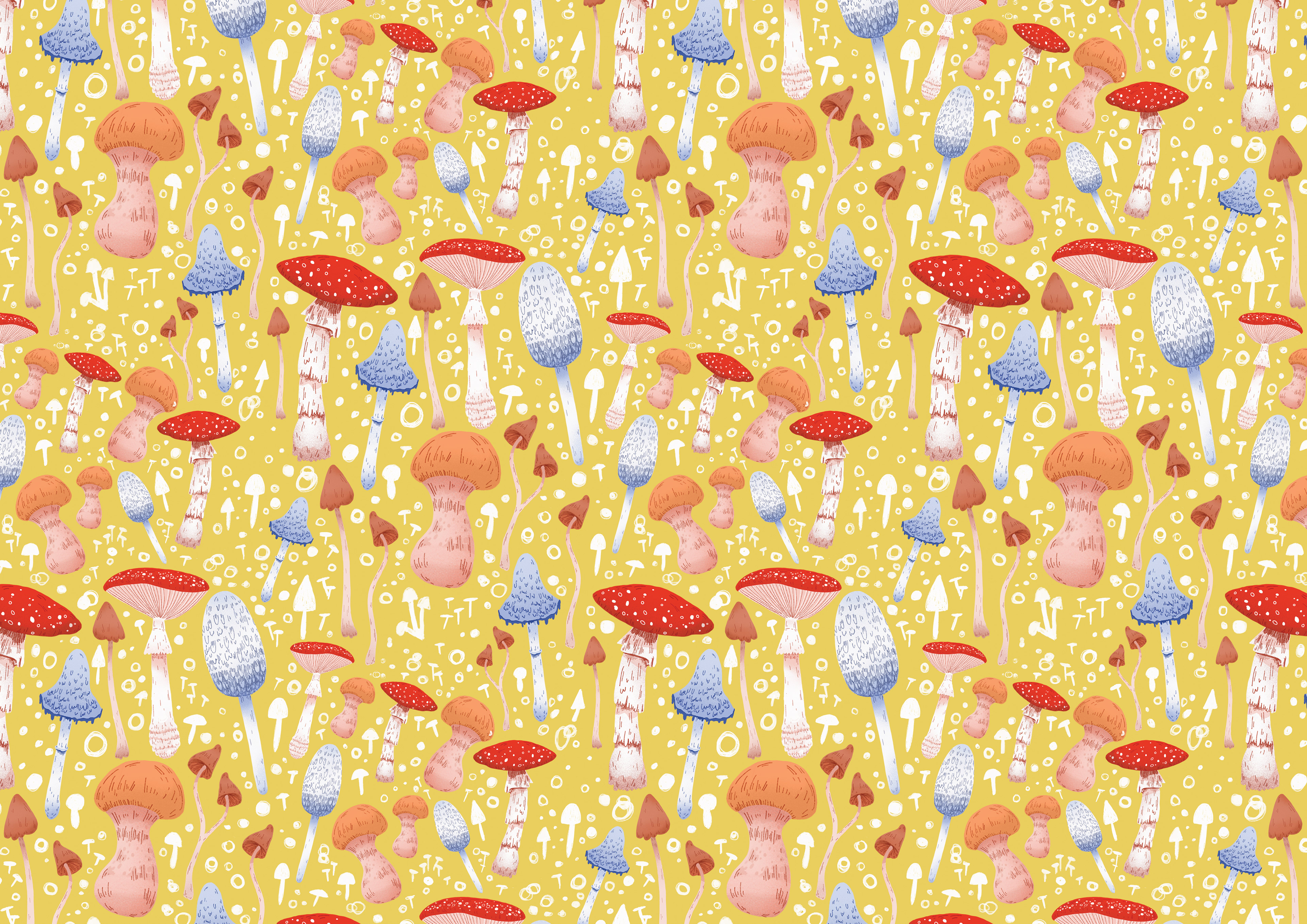 I love finding strange and interesting mushrooms when I walk my dog in local forests and they make such fun pattern designs. I also am obsessed with honey/mustard yellow hues at the moment and it really makes these fungi pop in this piece.
